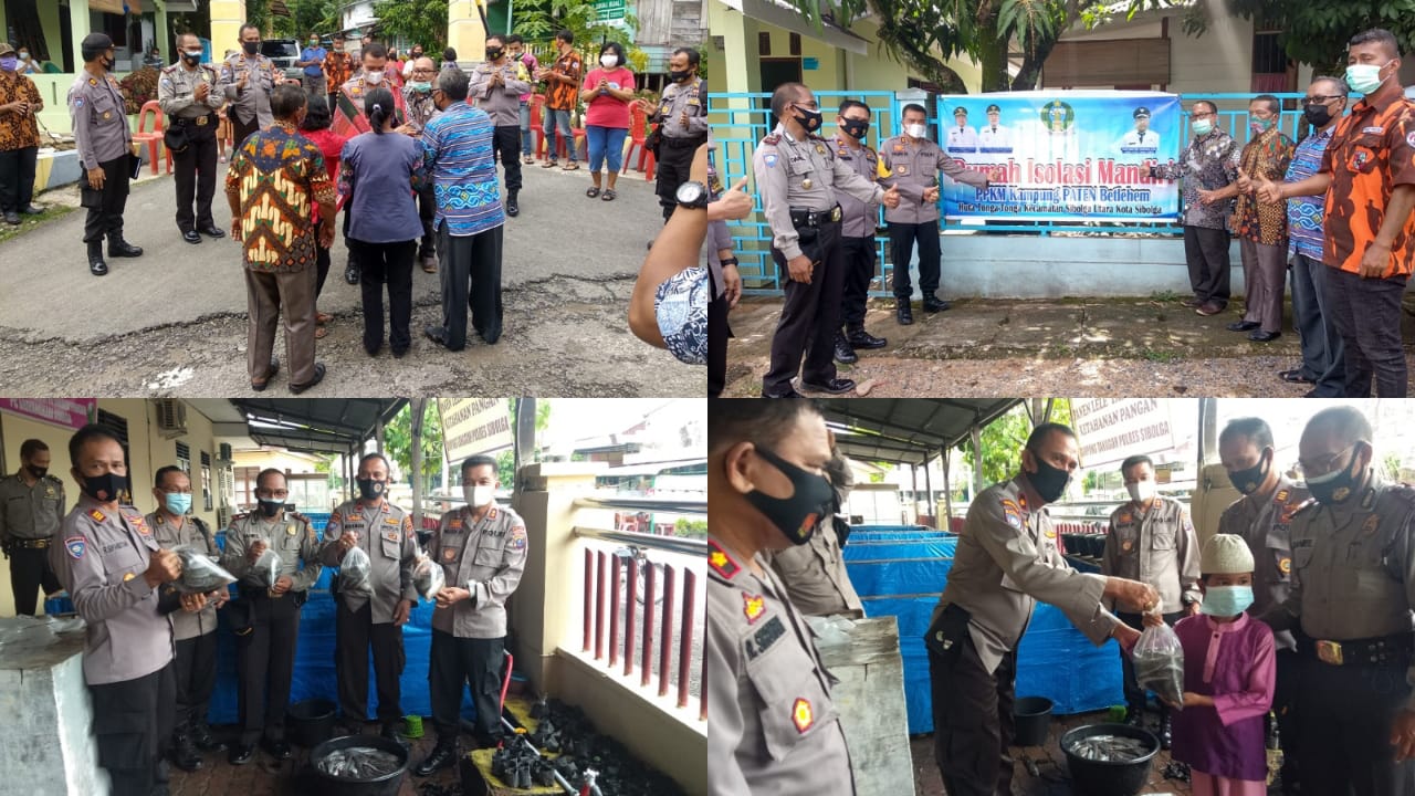 Dilokasi kampung tangguh, Wadir Binmas AKBP Drs. Parluatan Siregar, MH, didamping Waka Polres Sibolga Kompol R. Sihombing mewakili Kapolres Sibolga, bersama AKBP Budiman, SH, Kompol Mahmun, menyerahkan hasil panen lele 1 (satu) kantongan plastik/15 ekor ikan lele, kepada 50 orang anak yatim yang diterima oleh 4 org perwakilan anak yatim.