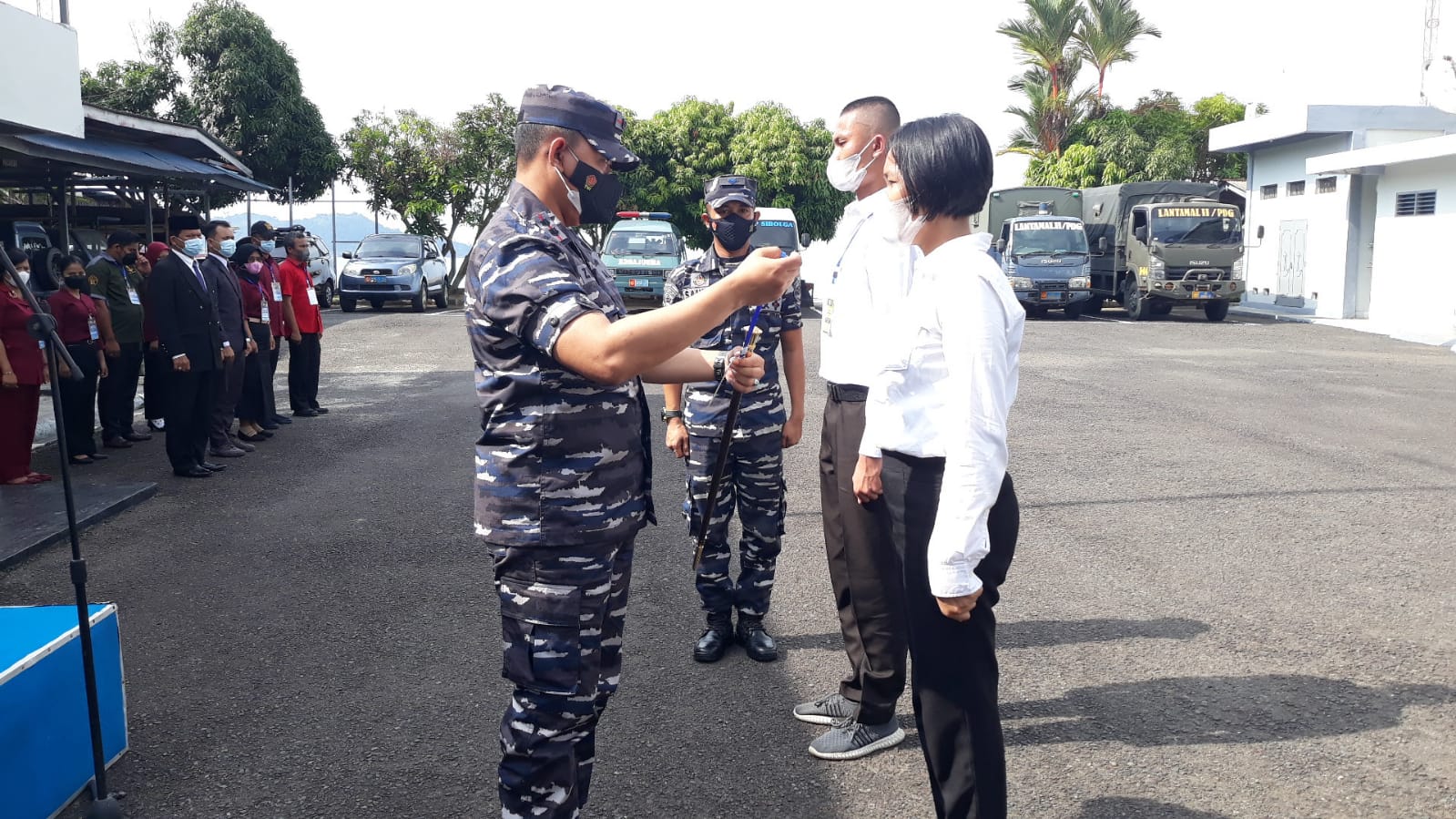 Sibolga – Danlanal Sibolga Letkol Laut (P) Syaifuddin Zuhri, M.Tr. Opsla secara resmi membuka kegiatan pembukaan pendidikan dasar bela negara Sekolah Tinggi Perikanan Sibolga Tahun 2021 di lapangan Trisila Mako Lanal Sibolga pada hari Kamis 9 Desember 2021 pukul 09.10 WIB (9/12/2021)