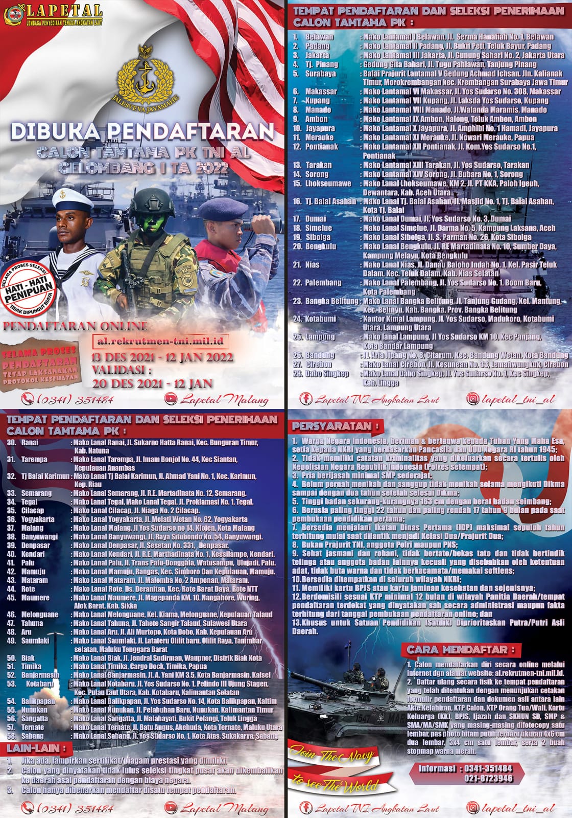 Pendaftaran Online Calon Tamtama dan Calon Bintara PK TNI AL Gelombang I TA 2022 dibuka sejak tanggal 13 Desember 2021 sampai dengan tanggal 12 Januari 2022. Sedangkan untuk Validasinya, dimulai sejak tanggal 20 Desember 2021 sampai dengan tanggal 12 Januari 2022.