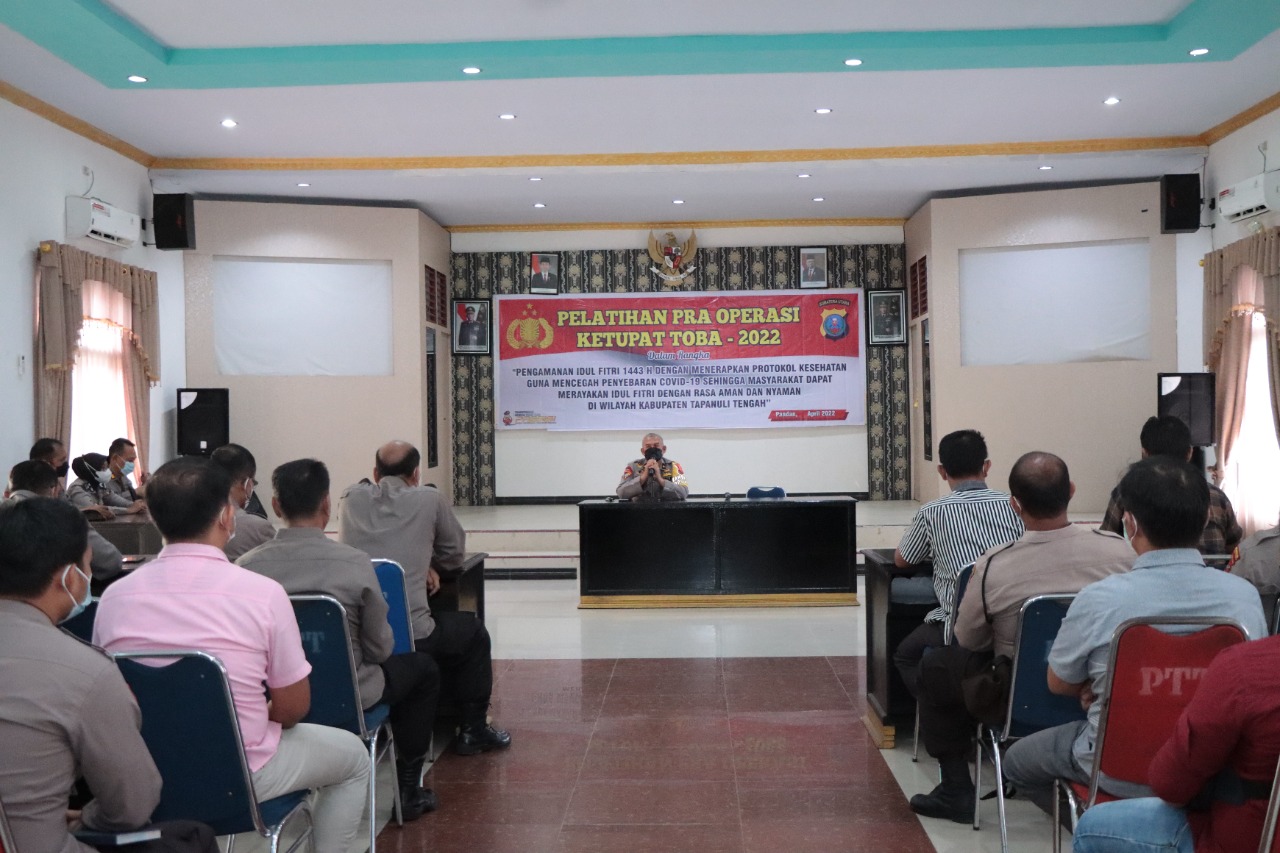 Tapteng  – Dalam rangka pengamanan perayaan Lebaran Hari Raya Idul Fitri 1443 H/2022 M pada kegiatan Operasi Ketupat Toba Tahun 2022, Polres Tapanuli Tengah menggelar Latihan Pra Operasi (Lat Pra Ops), yang dipusatkan di Aula Parama Satwika Polres Tapteng, pada Kamis (28/04/2022).