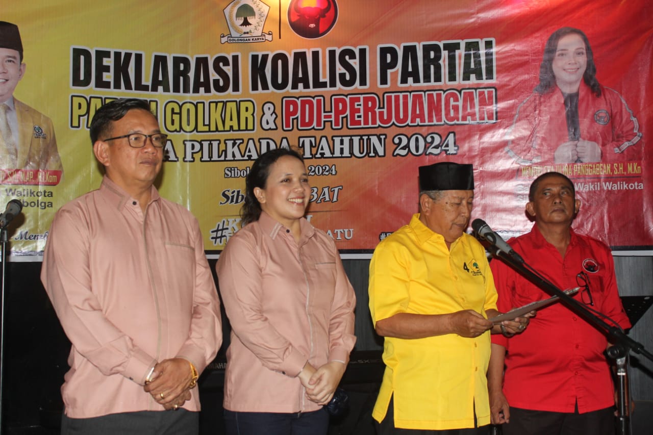 Sibolga (LN) -Ketua DPD Partai Golkar Kota Sibolga Dr (HC) Jamil Zebtumori SH, M.A.P, M.I.Kom bersama Ketua DPD PDIP Perjuangan Kota Sibolga Memori Eva Ulina S. h, M.Kn Panggabean gelar deklarasi Koalisi Partai, untuk calon Walikota Sibolga dan Calon Wakil Walikota Sibolga untuk pilkada Tahun 2024.