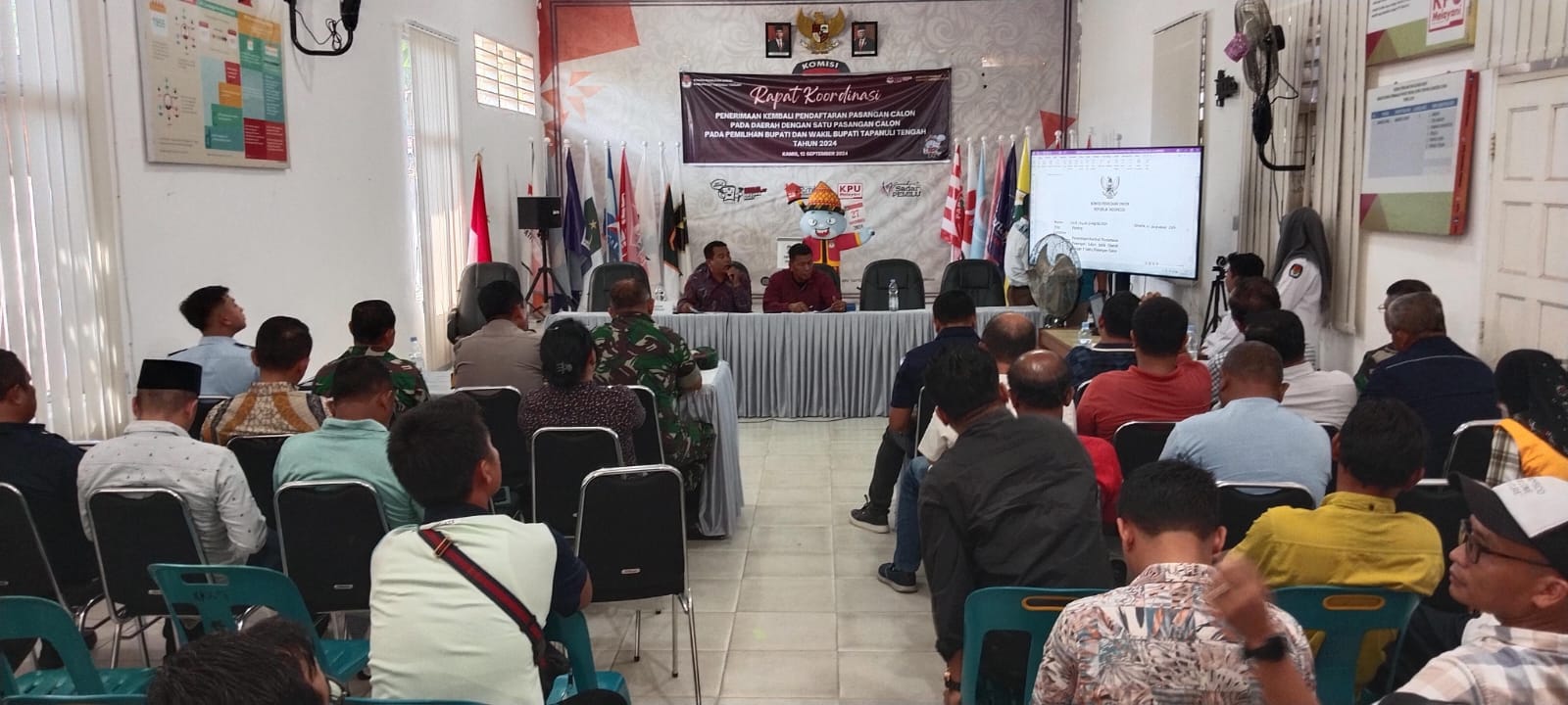 Tapteng (LN) – Menindaklanjuti surat KPU RI nomor 2038/PL.02.2.-SD/06/2024, KPU Tapteng menggelar rapat koordinasi bersama forkopimda, pimpinan parpol dan paslon bupati dan wakil bupati, di aula kantor KPU Tapteng di Jalan Marison, Pandan, Kamis (12/9/2024)