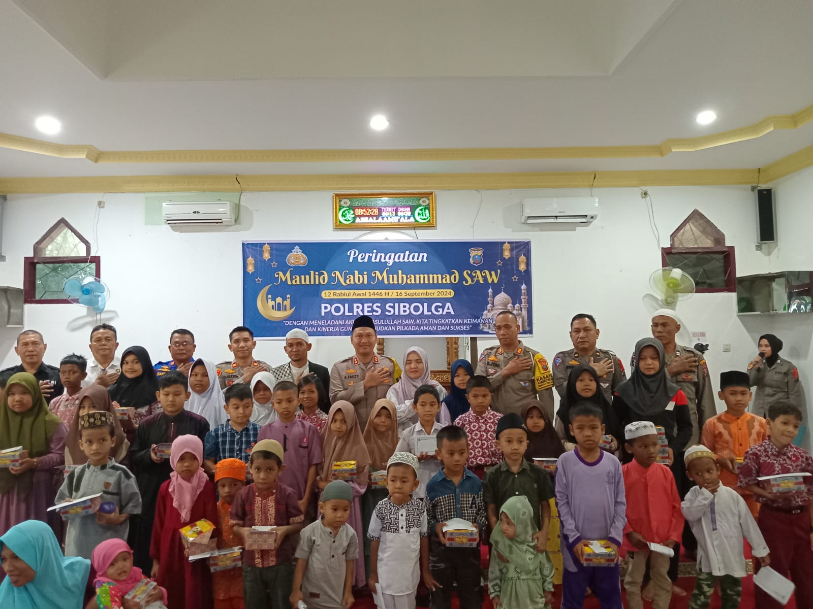 SIBOLGA – Kapolres Sibolga AKBP Achmad Fauzy, SH, SIK, MIK, dan seluruh Keluarga Besar Polres Sibolga serta Ketua Bhayangkari Cabang Sibolga, Pengurus dan Anggota Bhayangkari Sibolga, menggelar acara Peringatan Maulid Nabi Muhammad SAW 1446 H/2024 M yang dilaksanakan di Masjid Nurul Ikhlas Aspol Polres Sibolga Jalan Dr. Fl. Tobing Sibolga, Kecamatan Sibolga Kota, Kota Sibolga, pada Kamis, (19/09/2024).