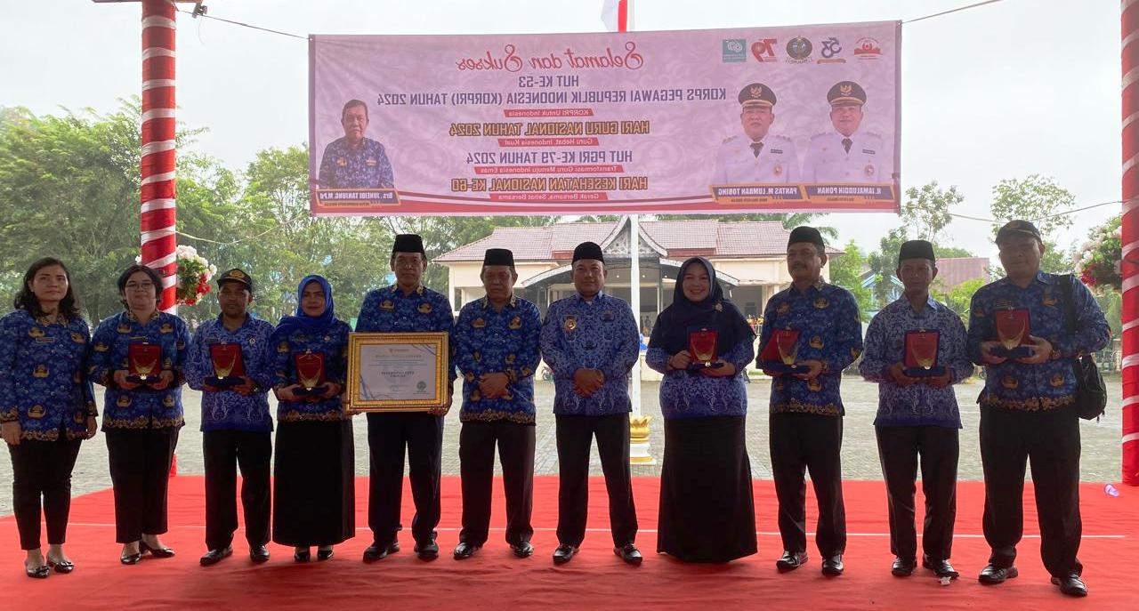 SIBOLGA (LN) – Wali Kota Sibolga, H. Jamaluddin Pohan, bertindak sebagai Inspektur Upacara pada upacara peringatan Hari Ulang Tahun (HUT) Korps Pegawai Republik Indonesia (KORPRI) ke-53, Hari Guru Nasional (HGN), Hari Ulang Tahun (HUT) Persatuan Guru Republik Indonesia (PGRI) ke-79, dan Hari Kesehatan Nasional (HKN) ke-60 tahun 2024, yang dilaksanakan di Lapangan Simare-mare Kota Sibolga, Senin (02/11/24) pagi.