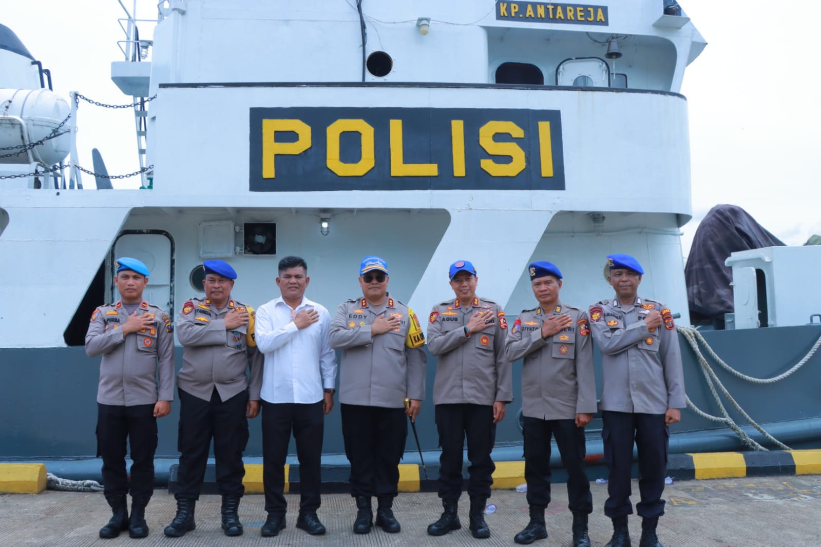 Dalam kunjungan tersebut, Kapolres didampingi sejumlah Pejabat Utama (PJU) Polres Sibolga, antara lain Kasat Polair AKP Syahrizal, Ps. Kasat Intelkam IPTU Firman Tampubolon, S.H., dan Kasi Propam IPDA Chandra Purba, S.H. Mereka disambut langsung oleh Komandan Kapal Antareja 7007, AKBP Agus Susanto, S.St., M.M., beserta jajaran, termasuk Kepala Kamar Mesin Kapal, AKP Giyato.