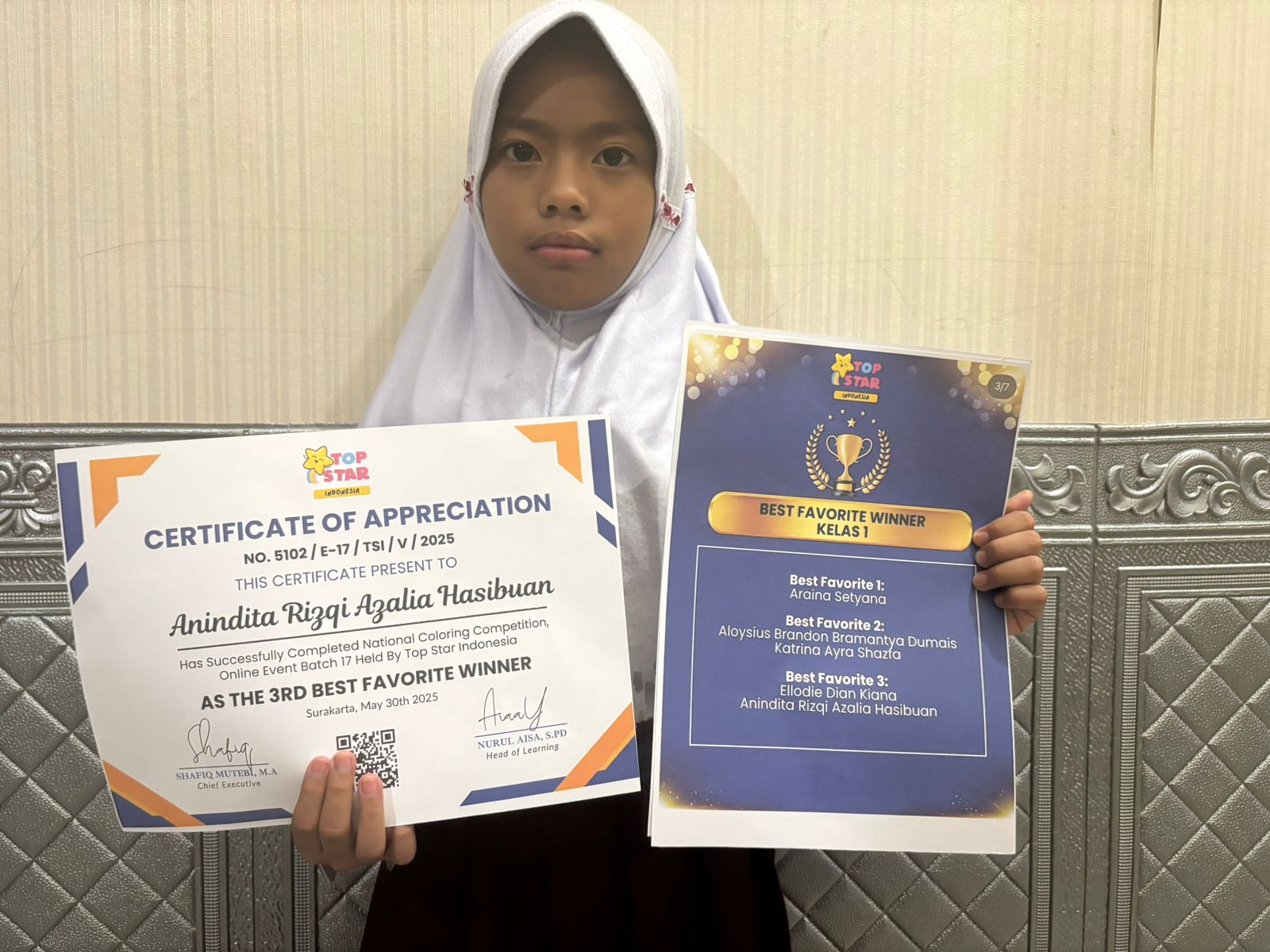 Keterangan Foto :Anindita Rizqi Azalia Hasibuan, Siswi SDN 085115 Sibolga Raih Juara 3 Best Favorite Lomba Mewarnai Tingkat Nasional