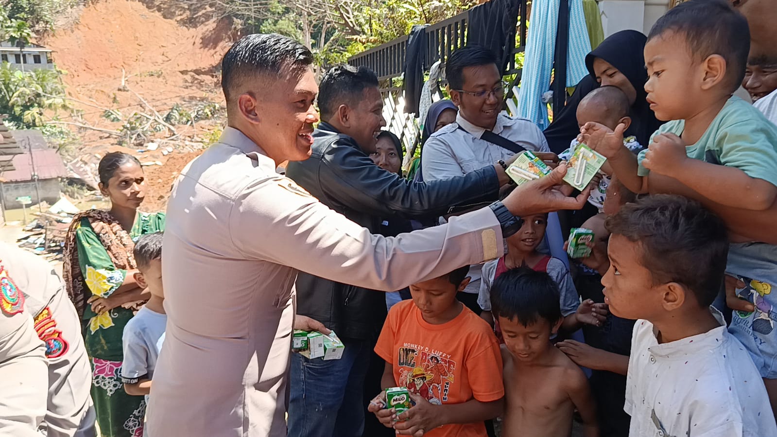 SIBOLGA (LN ) — Sejak pagi, anak-anak di pengungsian Jalan Murai sudah tampak duduk rapi menunggu kedatangan rombongan perwira muda Resimen Dharma Rakshaka Nayaka Angkatan 54. Ketika deretan anggota Polri memasuki area pengungsian sambil membawa kardus berisi susu kotak aneka rasa, tawa dan sorak kecil langsung pecah.