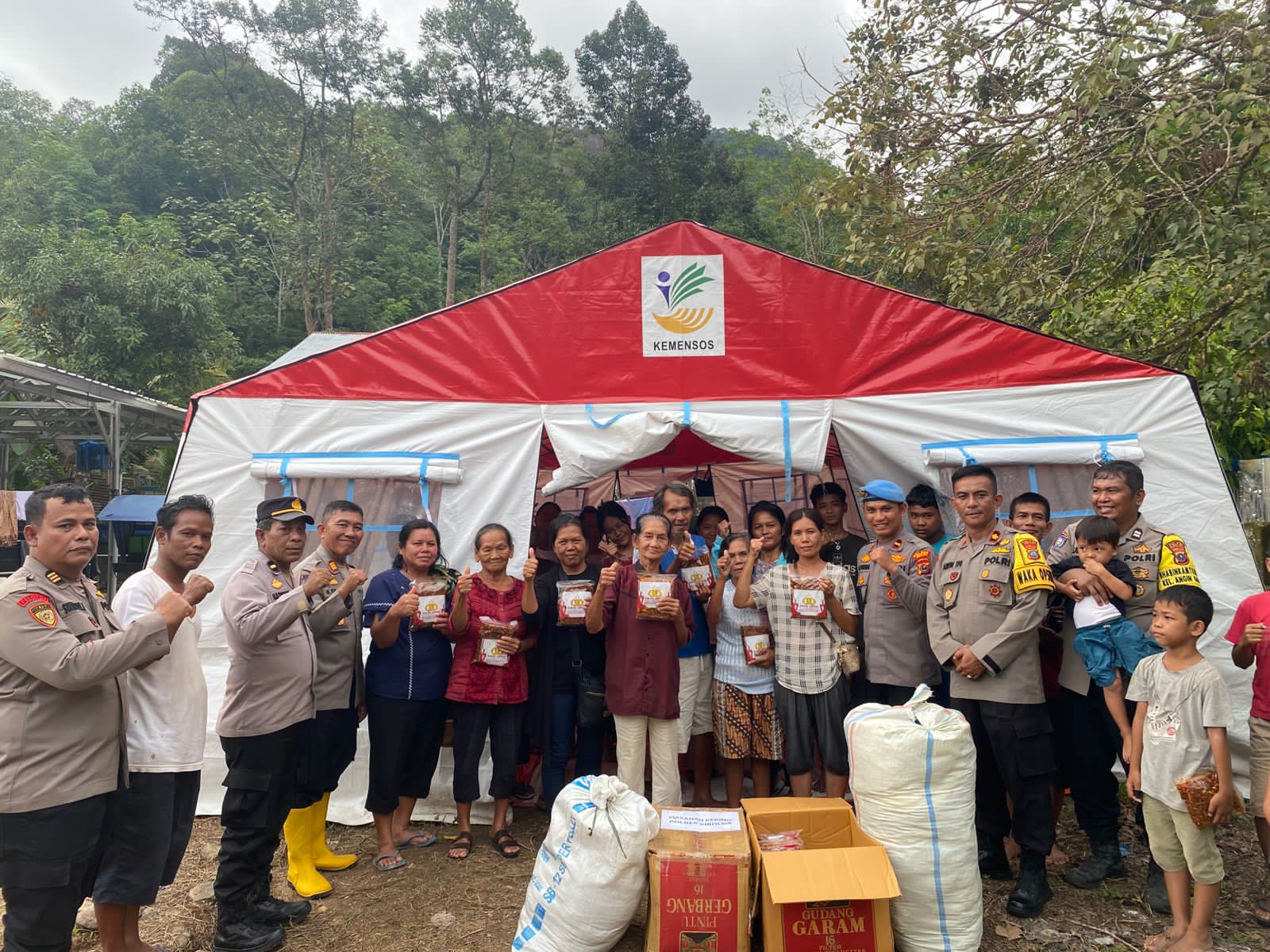 Bantuan sosial disalurkan kepada warga korban bencana banjir dan tanah longsor berupa empat dus makanan ikan teri sambal serta empat karung pakaian bekas layak pakai. Bantuan diserahkan langsung kepada para pengungsi guna membantu memenuhi kebutuhan dasar di tengah kondisi darurat.